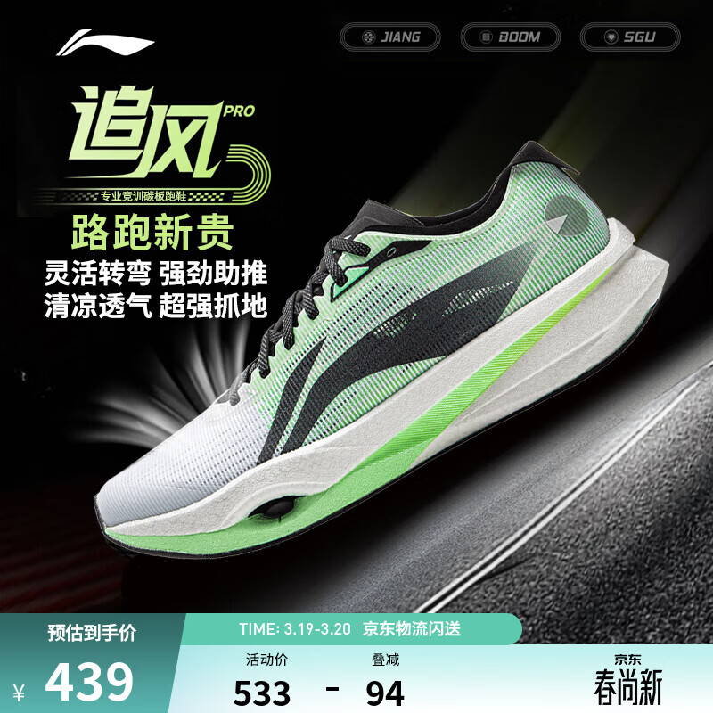 李宁追风pro|碳板跑步鞋男女鞋减震轻便透气百搭竞速专业运动鞋 白/荧青绿-1 42