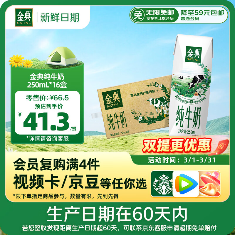伊利【新鲜日期】金典纯牛奶早餐奶整箱250ml*16盒 3.6g乳蛋白 礼盒装
